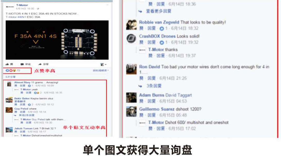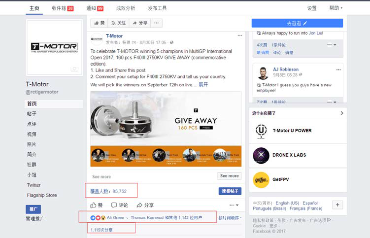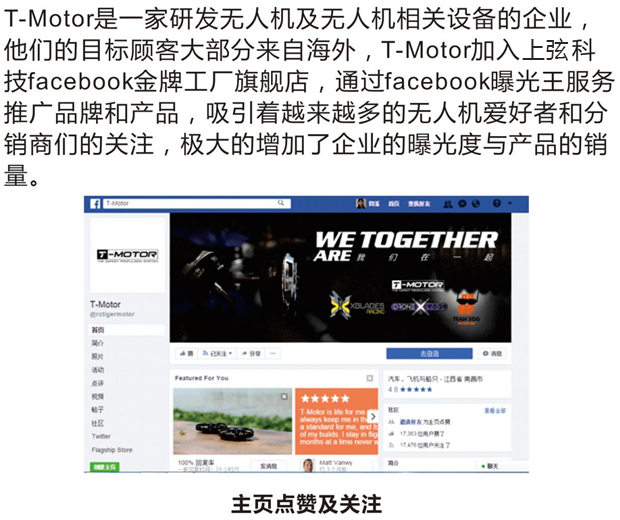 高級策劃顧問與T-motor溝通公司的品牌和產(chǎn)品定位,精選四個品牌產(chǎn)品關(guān)鍵詞;結(jié)合Facebook等社交媒體對用戶及用戶人群的定位,選取符合關(guān)鍵詞定位的上中游用戶群推廣T-motor,向真正對 T-motor的產(chǎn)品感興趣的意向客戶或關(guān)聯(lián)客戶精準(zhǔn)曝光T-motor的品牌、產(chǎn)品及金牌工廠旗艦店。