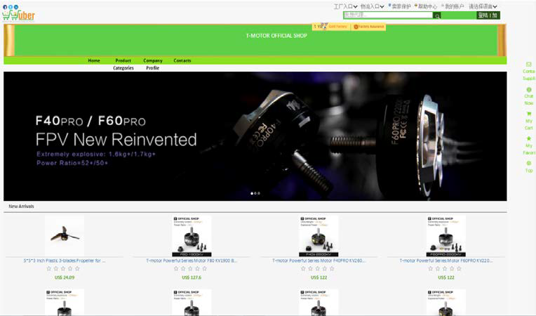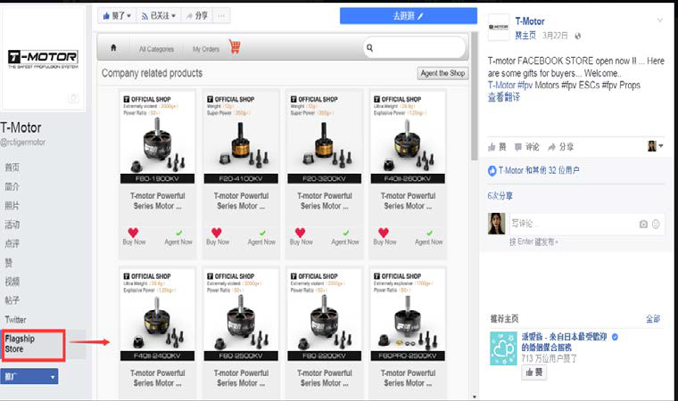 首先在擁有24億用戶的Facebook企業(yè)主頁上建立Facebook金牌工廠旗艦店,展示T-motor的各規(guī)格產(chǎn)品商品,通過資質(zhì)審核獲得全球金牌工廠認(rèn)證。需要購買的客戶分別通過BuyNow和AgentNow 進(jìn)行購買和分銷;然后建立全球品商分銷中心頁,前端在線招募分銷商,后臺管理分銷商及旗艦店業(yè)務(wù)。